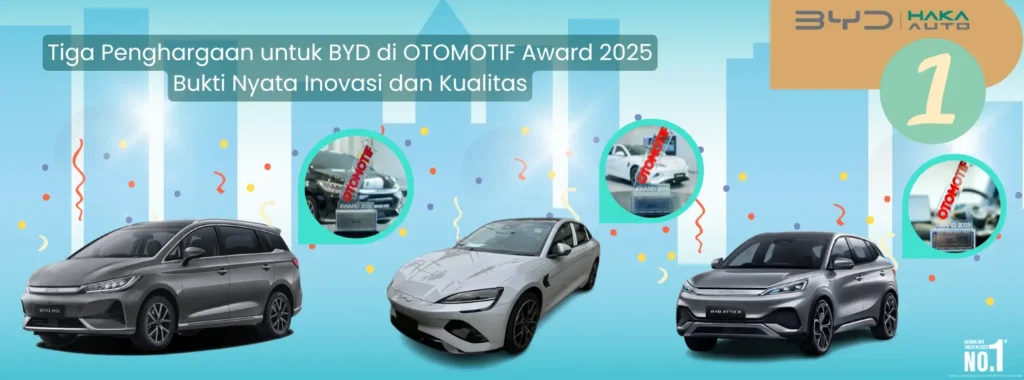 Tahun 2025 menjadi momen istimewa bagi BYD di Indonesia. Tiga penghargaan bergengsi berhasil diraih di ajang OTOMOTIF Award 2025, sebuah pengakuan atas keunggulan teknologi, desain, dan performa lini kendaraan listrik BYD yang kini kian digemari masyarakat Indonesia.